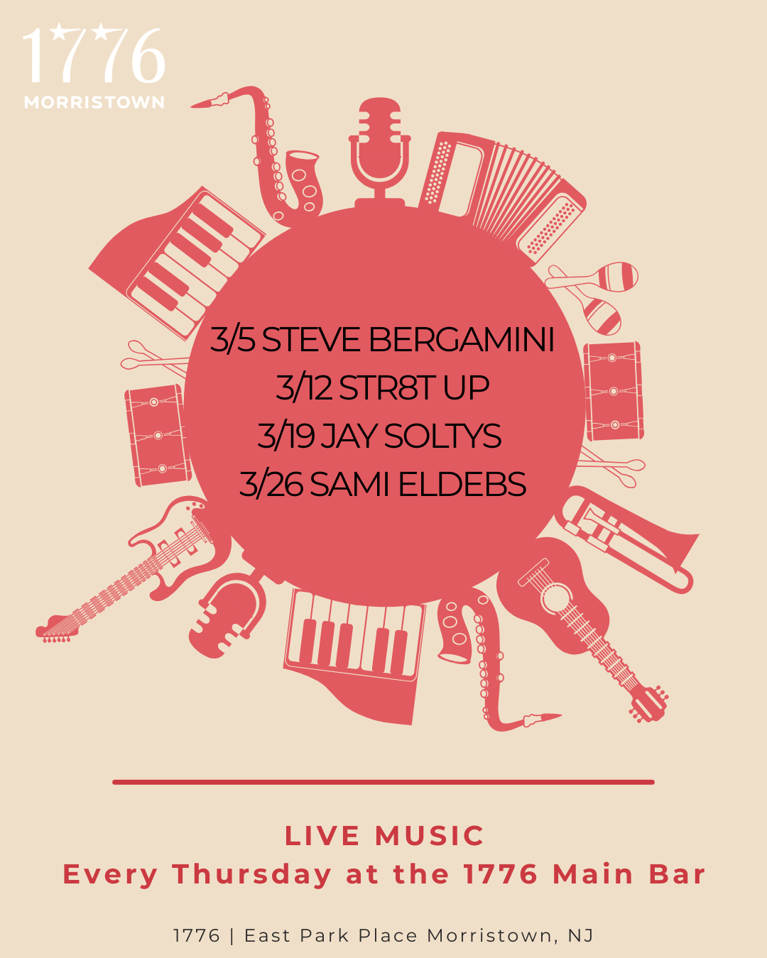 Join us every Thursday from 7–10 PM for live music at the 1776 main bar, featuring great sounds, vibrant energy, and the perfect atmosphere to unwind, socialize, and enjoy the evening.