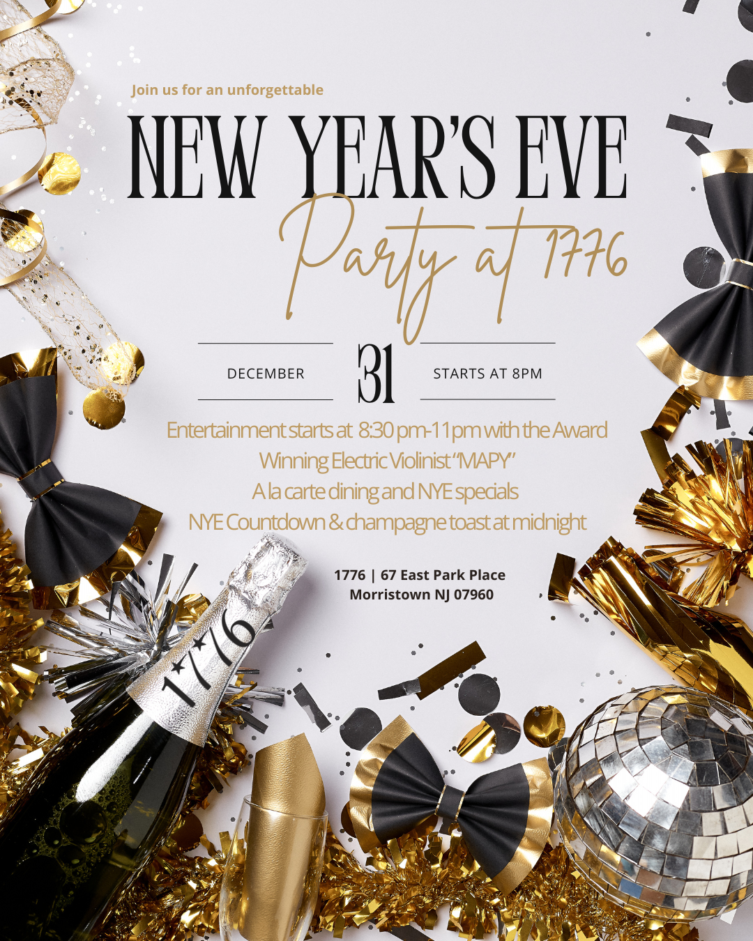 Celebrate New Year’s Eve at your favorite place, 1776—join us for dinner at the 1776 Morristown and enjoy our beloved a-la-carte menu, plus festive New Year’s Eve Specials. Watch the NYE Countdown live in the dining room on monitors and our tv screens at the '76 Main bar, toast midnight with complimentary champagne, and enjoy an unforgettable live performance by award-winning "MAPY" an electric violinist from 8:30–11:00 PM. Make your reservation NOW—we book fast!