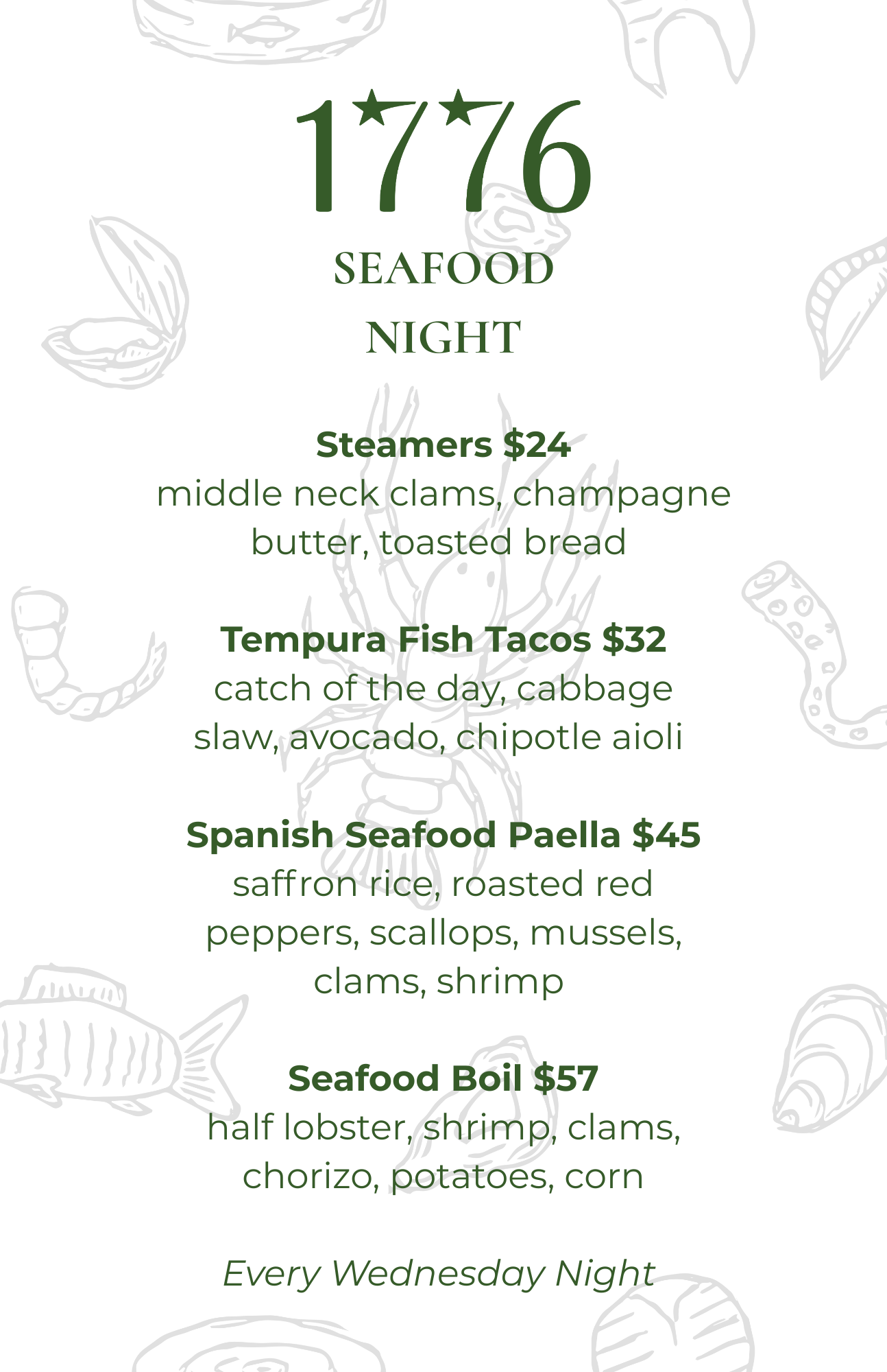 - Wednesday Seafood Night at 1776